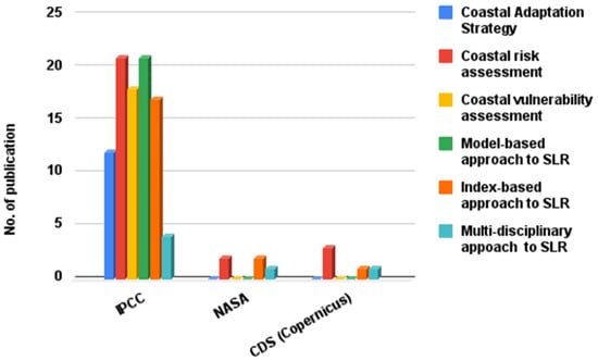 As a last analysis, the most common platforms to collect sea level data were taken into account. The results revealed that IPCC assessment reports were the main global data sources used in most of the considered papers (Figure 5). They were followed by the NASA and Copernicus data platforms. IPCC is considered a highly favored tool for conducting scientific coastal research since it provides regular assessments on climate change, its impacts and related risks, and options for adaptation and mitigation. According to Hinkel et al. [61], “the sea-level research contributing to the IPCC scenarios is an essential step towards understanding the Earth system”. The graphical representation in Figure 5 confirms that the majority of publications in regard to coastal risk assessment in the Mediterranean region was conducted using IPCC as the main data platform. IPCC provides users with various types of climate-related data for quantitative analysis. In this context, Aucelli et al. [31] used the mean sea level values of the scenarios RCP 2.6 and RCP 8.5, derived from IPCC [62] as the future sea level projections in 2065 and 2100 to assess the risk of coastal inundation due to relative sea level change along the southern coast of Italy. Similarly, in their study regarding susceptibility evaluation and risk assessment in the central Mediterranean area, Rizzo et al. [63] referred to both the global and local sea level projections provided in 2021 [8].