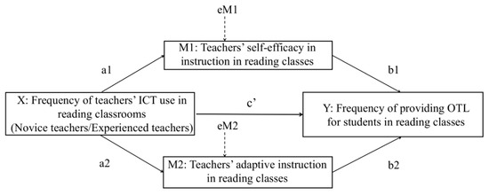 The self-efficacy of teachers in instruction and adaptive instruction are two significant influencing factors for teaching effectiveness, especially in complex learning environments such as learning with ICT facilities [19]. At the secondary education level, the reduction of teacher self-efficacy has an adverse effect on the engagement of teachers in classroom teaching, the maintenance of teacher–student relationships, and the stability of career development [20]. Providing students with adaptive instruction contributed to more efficient classes where students gain more improvement. In combination, these two factors explained teaching effectiveness to a large extent. Currently, there is less clarity provided on how teachers apply ICT to formulate and adjust their teaching practice while improving the efficiency of classroom teaching. The mechanism of teachers’ supportive behavior in the ICT-mediated reading class could be revealed by understanding relationships among teachers’ ICT use, self-efficacy, and adaptive instruction. Therefore, the current study seeks to investigate the relationships between teachers’ frequency of ICT use, in addition to the mediating effect of self-efficacy and adaptivity in the instruction in reading classes.