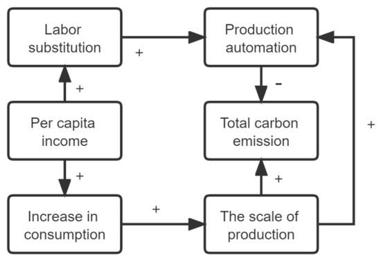 To analyze the role of production automation in the process of carbon emissions reduction, it is necessary to first clarify the relationship between the two. By reviewing the existing studies, we can confirm that there is a functional relationship between the per capita income and the carbon emissions in line with the CKC hypothesis [40], and the per capita income has a strong impact on the carbon emissions [41]. Previous studies have usually associated it with changes in the consumption levels and consumption preferences, and have believed that changes in the per capita income achieve a carbon emissions reduction through changes in consumer behavior [42]. However, when the research perspective is narrowed to the level of individual behavior, it may be difficult to explain the mechanism of the CKC [43]. Therefore, from the perspective of income changes for future industrial development trends, this paper attempts to put forward an analytical framework for the relationship between the per capita income and the total carbon emissions mediated by production automation, so as to discuss how an increase in the per capita income affects the total carbon emissions. The analytical framework is shown in Figure 1.