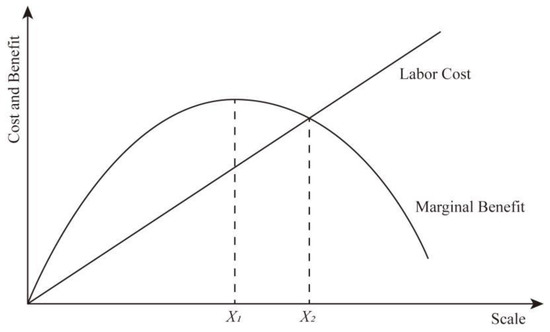 Production automation is essentially a reform of the production mode of the manufacturing industry. In this trend, the influence of wage income (the price of labor) on the process of production automation is different at different stages. The basis of this judgment is as follows: firstly, the scale of production is proportional to the wage income. The larger the scale of production, the higher the wage income [46]; secondly, according to the theory of a marginal effect of scale, there is an intersection between the marginal revenue and wage income. On the basis of these two conclusions, we can see that with an expansion of the scale of production (with the rise of the price of labor), the process of the change can be depicted as in Figure 2. In the diagram we can see two important points where the first is the apex of the marginal benefits of scale (X1), and the second is the intersection of the labor costs and marginal benefits (X2). These points, especially X2, can be helpful to understand the relationship between the labor price and production automation. The impact of labor price on production automation is manifested in two directions, which can be regarded as the characteristics of two development stages. In the early stage of large-scale development, the price of labor is relatively low, and the boundary effect generated by an expansion of the production scale makes it profitable for enterprises to expand production by increasing the labor;, therefore, there will not be a strong demand for the realization of production automation at this stage (in the left range of X2). With an increase in the labor price, the scale effect of expanding production will be gradually exceeded by the increase of the labor cost. In contrast, production automation becomes one of the options for cost control; therefore, there will be an increasing demand for production automation (in the right range of X2).