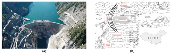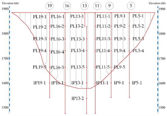 This study takes a concrete double-curvature arch dam in southwest China as an example. The dam is located in the main stream of the Yalong River at the junction of Muli County and Yanyuan County in Liangshan Yi Autonomous Prefecture, Sichuan Province. The aerial view, layout plan and location information of the dam are shown in Figure 3. The basin area above the dam site covers 103,000 square kilometers, with a total storage capacity of 7.76 billion cubic meters. The normal water level of the reservoir is 1880 m and the dead water level is 1800 m. The maximum dam height is 305 m. A number of plumb lines are laid at No. 5, No. 9, No. 11, No. 13, No. 16 and No. 19 dam sections to measure the radial displacement of the dam, as shown in Figure 4, where PL represents the plumb line system and IP represents the inverse plumb line system.