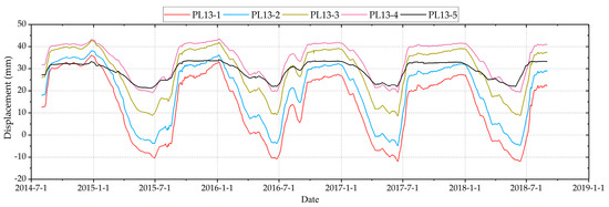 The process lines of PL13–1~PL13–5 are shown in Figure 5. It can be observed that the dam displacement at the five monitoring points on the same plumb line has similar variation rules but different amplitude of variation. With the decrease of the elevation of monitoring points, the variation range of dam displacement at monitoring points decreases gradually. The monitoring point PL13–1 located at the crest of the middle dam section has almost the largest annual variation among all the monitoring points. Therefore, we selected PL13–1 as the study object to establish a prediction model.