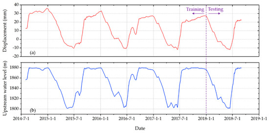 The dataset extracted from the monitoring database for this study spans August 2014 to August 2018 and contained 1163 sets of data. The monitoring data from August 2014 to December 2017 which contained 921 sets of samples was used to train the model, and the monitoring data from January 2018 to August 2018 which contained 242 sets of samples was taken as the testing set. The measured process line of the monitoring data is drawn in Figure 6, in which the positive values represent the radial displacement towards downstream. The process line of the upstream water level in the corresponding period is also drawn in Figure 6. It can be seen that the radial displacement of the dam is closely related to the reservoir water level.