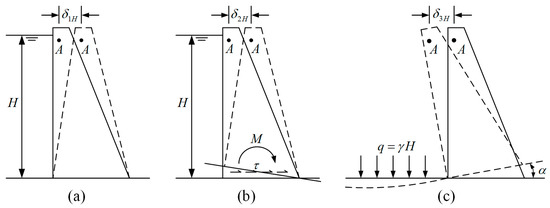 The causes of horizontal displacement of concrete dam: (a) displacement caused by direct action of hydraulic load on the dam body, (b) displacement caused by foundation deformation due to hydraulic load and (c) displacement caused by the rotation of foundation surface due to water weight.