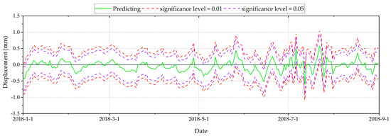 It should be noted that the measured displacement falling outside the interval is generally regarded as an outlier. The outliers are suspected of abnormal displacement but they are not necessarily. The causes of outliers should be investigated to further determine the operation state of the dam. Mathematically speaking, even if the prediction error of the model strictly follows the normal distribution, when the significance level is 0.05 or 0.01, 5% or 1% of the measured values will still be judged as outliers, although this is due to random error. In fact, the dam in the case study has been operating safely for the duration of our study, so all outliers are not abnormal displacement and should be considered misjudgments.