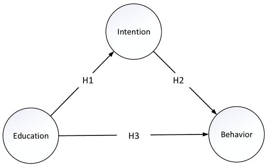 Education is believed to be one of the predictors shaping one’s behavioral intentions. In the context of consumer behavior, one study presented important findings in the field of education and purchasing intention and the relationship between education and changes in green purchasing preferences [41]. In addition, Hu and Zhang showed that the level of education and discipline had a significant effect on a person’s behavioral intentions [42]. Moreover, Shimul et al. stated that through relevant environmental information or knowledge, consumers would be more educated, aiming to influence attitude in a positive way as well as purchasing intentions [11]. In perceptive SOR theory, the stimulus sector can be a person’s awareness [22]. This sector includes the individual’s active motives, moods, perceptions, cognitions, and so on [23]. A person’s awareness, motives, perceptions, and cognition are certainly formed from their educational experiences, including formal educational experiences. Therefore, the first hypothesis that can be proposed is as follows:
