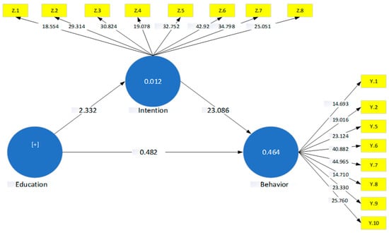 Based on Table 3, the values of all constructs were in the range of very low (1.00–1.80), low (1.81–2.60), medium (2.61–3.40), high (3.41–4.20), and very high (4.21–5.00). Based on these data, it appears that the latent construct “education” had a mean value of 3.202. This means that the level of employee education was in the medium category. Moreover, the latent construct “intention” showed a mean of 4.664, which was included in the very high category. Moreover, the latent construct “behavior” had a mean of 4.264, which was included in the very high category.