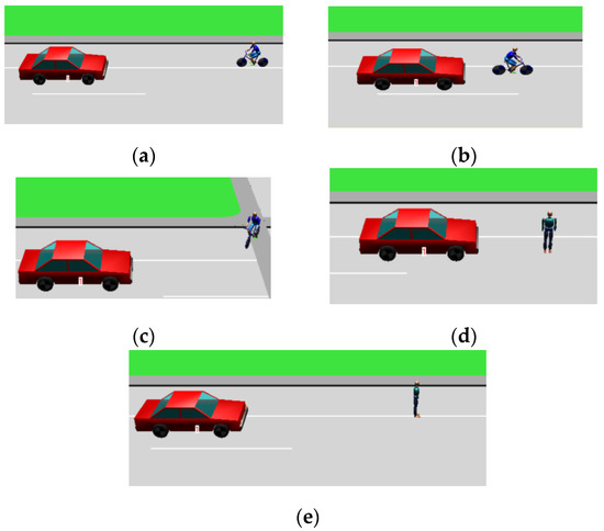 Collision scene reconstruction of typical accident scenarios: (a) Riding against traffic; (b) Riding on motorway; (c) Not slowing down while turning; (d) Jaywalking; (e) Walking on motorway.