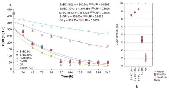 The average influent COD level was 419.66 mg L−1 and that reduced to a range of 58.80 ± 17.04–293.67 ± 26.78 mg L−1, 46.80 ± 16.23–281.02 ± 19.60 mg L−1, 30.60 ± 6.09–261.29 ± 30.52 mg L−1, 175.90 ± 23.43–330.34 ± 35.58 mg L−1, and 265.80 ± 22.66–378.12 ± 17.50 mg L−1 in S + BC5%, S + BC10%, S + BC15%, S + GR and GR setups, respectively (ANOVA: F = 242.194, p < 0.001) (Figure 2). The maximum COD reduction was recorded in S + BC15% (92.71%), followed by S + BC10% (88.85%), S + BC5% (85.98%), S + GR (58.09%), and GR (36.66%) CW units. HSD test suggests no difference among CWs with different BC doses (ANOVA: Tukey’s t-test, p = 0.064) for COD removal. COD reduction showed a direct relationship with BC dosing in the CWs in our study, and that could be attributed to its porous morphology, which enriches the substrate with oxygen packets [37], helping in microbial-mediated oxidative reduction of organic pollutants in the substratum. A study by Zhou et al. [38] also suggested the significance of BC addition in substrate matrix and they achieved a higher COD reduction, i.e., 91.80% in BC amended setups than that of non-BC setups (83.49%). Further, Chand et al. [37] also documented a high COD reduction (92.6%) in BC-amended CWs, suggesting a direct role of BC amendments in DO supply in CWs. BC has been seen as a valuable addition due to its diverse advantages, which can be described as: (a) BC provides a heterogeneous surface apart from a porous surface which provides more DO in the substrate; (b) furthermore, researchers have acknowledged that the addition of porous carbon-rich material in the substrate matrix helps in the growth of beneficial microbes in substrate matrix thus helping in the reduction of pollutants through metabolic oxidations [39]; (c) the presence of Wolfia in floating CWs might have also played an important part in achieving the overall removal of COD. Previous studies have also found the role of aquatic plants in COD removals. For example, Dinh et al. [15] in their study found the significance of the Lemna minor in wastewater treatment in which they reported 74% and 71% COD reduction with and without duckweed, respectively. Adhikari et al. [16] reported a COD removal efficacy of 81% in CWs operated with dairy wastewater. S + GR and GR floating CW setups showed poor COD reduction acknowledging the direct role of BC, which probably enriches microbial growth [38]; improves adsorption rates [8,38]; activates electrostatic attraction/or shock, intermolecular-hydrogen holding, and π–π interaction foundations [2]. Probably all these factors could be involved in the higher reduction of COD.