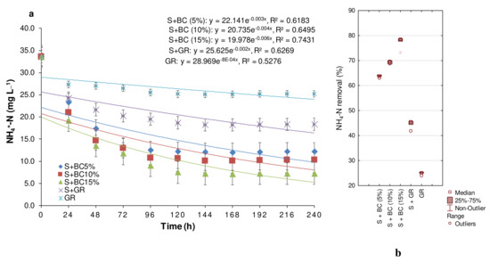 The influent NO3-N and the NH4+-N loads were 95.25 ± 7.65 mg L−1 and 33.48 ± 2.93 mg L−1, respectively, which reduced rapidly during treatment by CWs (Figure 3 and Figure 4). The maximum NH4+-N reduction efficacy was found to be 64.28, 69.99, 78.79, 45.78, and 25.43% in S + BC5%, S + BC 10%, S + BC15%, S + GR, and GR reactor units, respectively. NH4+-N reduction rate showed statistically significant differences among setups (ANOVA: F = 201.908, p < 0.001); however, HSD test suggests no difference between S + BC5%, and S + BC10% setups (ANOVA: Tukey’s t-test, p = 0.213). The effective removal in BC-aided setups could be due to the NH4+-N adsorption potential of BC, as evidenced in previous reports [9,40]. The reduction of NH4+-N through the nitrification process could be the main mechanism under an anaerobic environment in CWs, which is supported by the supply of oxygen through atmospheric diffusion and duckweed-mediated root respiration. In addition, porous morphology and cracks/holes in BC might have enriched CW bed layers with high DO [38]. The morphological advantage in BC also provides habitats to microbial groups, which drive the reduction of N in the substrates [41]. Plant uptake is considered another valid reason for the loss of NH4+-N in the DW-supported CW setups [10]. Phytoremediation is another possible mechanism responsible for the removal of the NH4+-N as acknowledged by previous researchers. For instance, Toyama et al. [13] found the removal of 2.0–10.8 mg total dissolved N from a high N loading (20–50 mL) wastewater using four different types of duckweed ponds, and their study revealed that bio-transformation was the key process for N loss during the treatment by duckweed. Further, a low removal of NH4+-N by S + GR and GR setups could be related to insufficient oxygen in such systems as oxygen becomes competitive for oxidative removal of COD and N in the later phase of treatment [3]. Better NH4+-N reduction in BC-amended reactors could be attributed to the collective influence of plant uptake, sand, BC, adsorption rate in the substrate, ammonia loss, and trade of cations for ammonium [42,43].