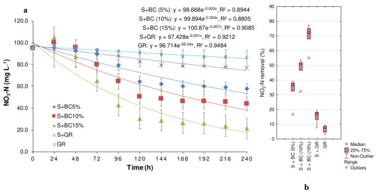 - de Rozari, P.; Greenway, M.; El Hanandeh, A. Nitrogen removal from sewage and septage in constructed wetland mesocosms using sand media amended with biochar. Ecol. Eng. 2018, 111, 1–10. [Google Scholar] [CrossRef]