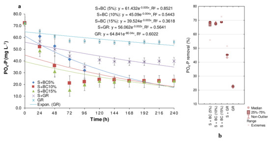 PO4−3 concentration in the influent was 72.37 ± 4.89 mg L−1, which was reduced significantly in all the reactor units (Figure 5). The maximum removal was recorded at 69.39, 70.77, 79.06, 51.44, and 23.84% in S + BC5%, S + BC10%, S + BC15%, S + GR, and GR setups, respectively. PO4-P reduction showed a statistically significant difference among studied floating CWs (ANOVA: F = 237.323, p < 0.001), but the HSD test suggested no difference among BC setups (ANOVA: Tukey’s t-test, p = 0.681). The previous literature has documented the evidence of PO4−3 reduction via adsorption, precipitation, or build-up processes in substrate medium [23,24,45]. The role of BC in P removals through adsorption is also documented in a previous study by Lise Bolton [23], who found that mineral phases on BC surface play a vital role in P removal from wastewater when treated with a CW amended with BC in substrate matrix. Duckweed setups with BC showed a major difference in PO4−3 removals, possibly due to the BC inhabiting microbes, which probably boosted the bioconversion of P into microbial mass. Porous structures in BC also hold P salts as feed for inhabited microbial communities. In an investigation, Kizito et al. [2] revealed that alteration in media apart from the conventional ones could enhance the reduction of PO4−3-P, which also seems to be one of the possible mechanisms in our study, especially in reactor units with conventional substrates. Further phytoaccumulation of available P could be one of the reasons for PO4−3-P loss in the effluent. Few earlier studies have shown accumulation of P in planted biomass of CWs: 0.01–19 g P m−2 [7]; 2.6–5 g P m−2 [46]; 0.155–0.344 [47]; 7.8–12.3 P m−2 [3], suggesting the role of plant stand in P removal mechanisms. Apart from this, other factors controlling PO4−3-P reduction could be temperature, interaction with redox potential, and pH in substrates during CW operations [10].