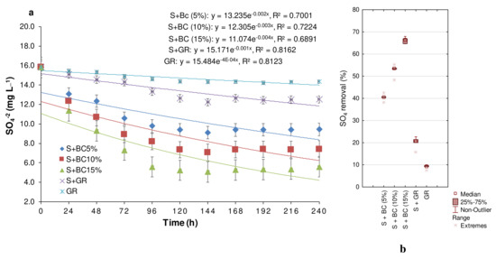 Throughout the experimental period, the influent SO4−2 concentration was 15.81 ± 1.98 mg L−1 which reduced significantly in all setups over the experimental period. The maximum of SO4−2 removal was 42.38, 55.28, 67.93, 22.65, and 10.0% in S + BC5%, S + BC10%, S + BC15%, S + GR and GR reactor units, respectively (Figure 6). The SO4−2 reduction showed a significant difference among different CWs (ANOVA: F = 91.676, p < 0.001); however, the HSD test suggests no difference between S + GR and GR units (ANOVA: Tukey’s t-test, p = 0.056). The previous literature suggested phenomena such as uptake by the plant, nitrate reduction, deposition in chelated forms, etc., for removal of SO4−2 during wastewater treatment [48]. Studies also suggested metabolism by sulfate-reducing bacteria [49] and plant uptake [10], another important route for SO4−2 reduction in wastewater when treated by CWs. However, the co-removal of NO3 and SO4-S during sulfur oxidation in CW is also reported in the literature [1]. In summary, BC addition supported the SO4−2 removals in CWs, but metabolism by aquatic macrophytes was the prime mechanism of the SO4−2 removals in CWs.