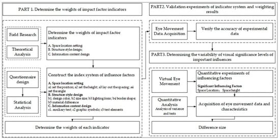 The research process and the required tools for this study are shown in Figure 1, and the process consists of three parts. The first part was the preliminary determination of the influencing factors of the underground commercial street guide signs and the index weights of the influencing factors. Through field research and theoretical analysis, we determined the significant categories of influencing factors, analyzed the specific influencing factors of the visual prominence of guide signs, utilizing questionnaires, constructed the index system of influencing factors, and determined the weight of each index. The second part was to verify the results of the index system and weights of the influencing factors of the underground commercial street. The accuracy of the experimental data was verified by collecting eye-movement data from the experimenter with the help of an eye-movement device. The third part was to conduct quantitative experiments on the critical influencing factors to determine the variability of the visual saliency level of the essential influencing factors by conducting quantitative experimental research on the essential influencing factors with the help of virtual eye movements. Then, we obtained the eye-movement data and characteristics under each control factor variable, and conducted quantitative analysis with the help of data processing software to obtain the magnitude of variance and provide solutions for the design of guide signs in underground commercial streets.