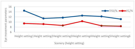 Since this experiment investigated the effect of differences in the height settings of guide signs on visual saliency, the analysis of the results of this experiment was conducted only for the eye-movement parameter data of the six experimental scenes (that is, no visual hotspot map analysis was involved). The four eye-movement parameters were first subjected to chi-square analysis (p > 0.05). Then, the variance test was performed to remove TFD and FC, which showed saliency (p < 0.05), and the two eye-movement indicators TFF and FFD, which would not show saliency (p > 0.05), were used for the parameter analysis (Table 22). The parameters of the eye-movement data and the matched heights for the area of interest are shown in Figure 4.