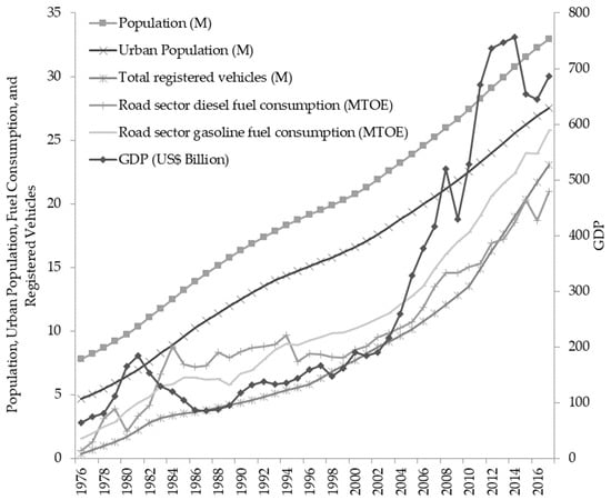 The trends of input and output data along with road sector fuel consumption for the period between 1976 and 2017 (Adapted from [41]).