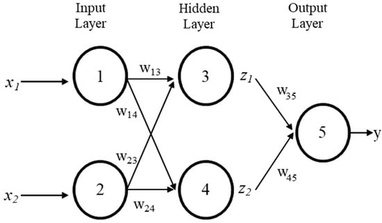 An ANN is a system of interconnected computing nodes (neurons). The information is processed similarly to how the human brain would. Multilayer perceptron (MLP) networks are the most popular type of neural networks. Each layer consists of neurons. Every neuron has a different weight associated with it. The information is passed from the input layer through hidden layers and finally reaches the output layer. Every neuron except the neuron in the input layer receives the information from the neurons in the preceding layer. After this, the neuron passes information to the output through a sigmoid function [55,56,57,58]. A training algorithm is adopted to obtain the weights while the algorithm minimizes the cost function, such as mean squared error considering the target and the model output. A general representation of a neural network is shown in Figure 4. As can be seen, the network consists of two inputs, one output, and one hidden layer. The input layer is not associated with any calculations; it simply transfers the input to the first hidden layer, while the remaining connections carry real-valued connection weights that modify the signal strength carried by other nodes. As inputs, the node of hidden layers and output layer receives the sum of the previous layer’s weighted outputs and the bias. The corresponding activation function modifies the input and transfers the result to the nodes of the subsequent layer or the environment.