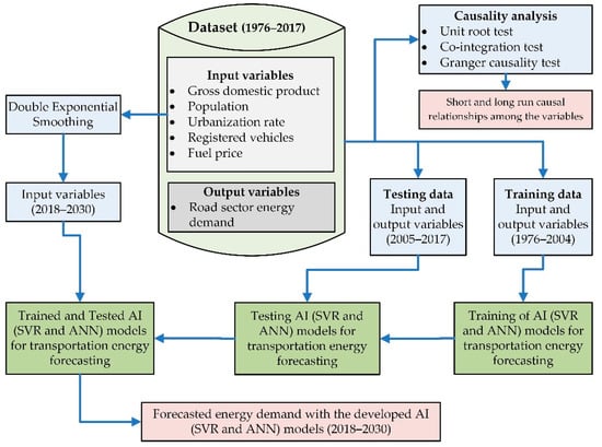 This section briefly discusses the data used for the development of AI-based energy demand models in the transport sector of Saudi Arabia. In addition, it introduces the approaches for causality analysis and energy demand projection. In addition, the step-by-step procedure for the model development is shown using a flow chart in Section 2.4.