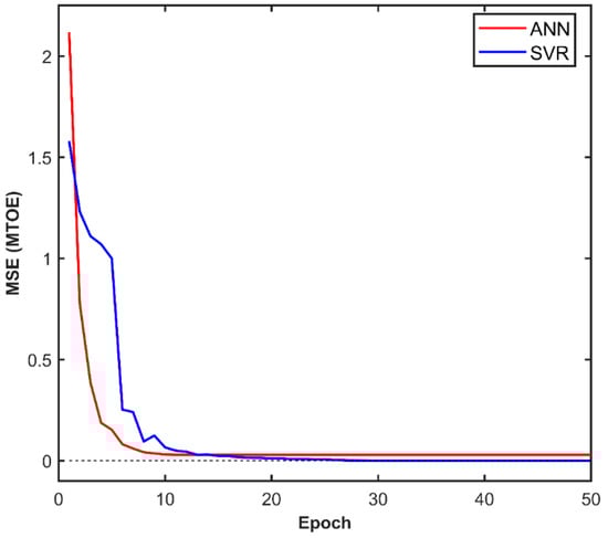 The important hyperparameters of an ANN include the number of hidden layers, the number of neurons in each layer, the learning algorithm, the activation function, the learning rate, and the learning goal. Due to the small dataset, only one hidden layer was considered in this study. The number of neurons in the hidden layer was ascertained through a systematic trial and error approach considering 1 to 4 neurons. The mean absolute percentage error values for the training dataset varied between 4.34% and 9.35% for the considered neurons. The testing results varied between 4.82% and 5.26% for the same number of neurons. The ANN with three neurons in the hidden layer with an activation function of tan-sigmoid, a learning rate of 0.00002, and a goal of 0.000001 produce the best result considering both the training and the testing results. Figure 6 presents the comparative analysis of ANN and SVR models in terms of mean squared error (MSE) index where the minimum values for the models were 0.0295 (MTOE) and 0.0001 (MTOE), respectively.