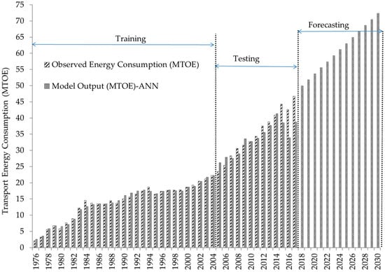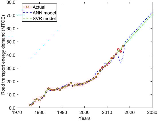 The ANN and SVR models were developed using MATLAB software. Data sets from 1976 to 2017 were used for analysis. Data from 1976–2004 were utilized for training, whereas data from 2005–2017 were used for testing. The data were projected up to 2030 using a double exponential smoothing technique. Data and trend smoothing factors were selected using the systematic trial and error process. Road transportation energy consumption was modeled using the projected input. Two important hyperparameters which need to be specified in the SVR model are appropriate C and ε values. With the goal of maintaining a balance between the learning error and the complexity of the model, C determines the optimal number of support vectors. The lower and higher C values are associated with underfitting and overfitting, respectively. When used to SVR, the ε is a normalization setting that establishes a compromise between error margin and model robustness to produce optimal adaptation on a new testing dataset. The smoothness of SVR’s response is affected by the value of ε. As a result, the model’s complexity and predictive validity rely on the parameter value of ε. After many systematic trial and error experiments, the values of C and ε are fixed to 1000 and 0.001, respectively. The conceptual framework of the suggested AI-model for predicting Saudi Arabia’s energy needs for road transport is depicted in Figure 5.