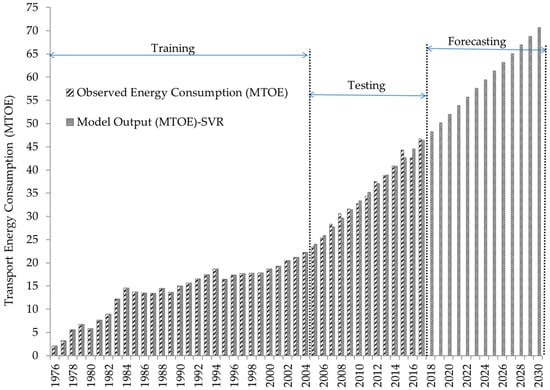 - This paper develops an SVR model for forecasting energy consumption in the Kingdom’s road transportation between 2018 and 2030 using a double exponential smoothing method using the projected input dataset.