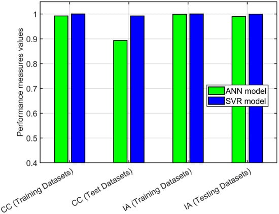 The input variables are forecasted to project the road transportation energy demand for Saudi Arabia between 2017 and 2030 (Figure 7 and Figure 8). Both the training (1976–2004) and testing (2005–2017) datasets are used to assess the created model’s efficacy. The model appears to produce results near the observed values for both training and testing datasets. Figure 9 presents the comparative illustrations of the machine learning models predicted energy demand for the road transportation sector of Saudi Arabia with actual energy demand. As can be seen, the SVR model predicted numbers are much closer to the actual numbers than ANN predicted numbers. Therefore, the superiority of the SVR model over the ANN model for the case under study (Saudi Arabia’s transportation sector energy prediction) is verified. The effectiveness of the model is assessed with the help of the root mean squared error (RMSE), mean absolute error (MAE), mean absolute percentage error (MAPE), correlation coefficient (CC), and Willmott’s index of agreement (IA). The values of IA for an ideal match and complete disagreement are 1 and 0, respectively [59]. The created model shows satisfactory performance on the training and testing datasets, as shown by the estimated values of the investigated performance measures (Table 5). The comparative analyses of the achieved performance indices for both machine-learning models are presented in Figure 10.