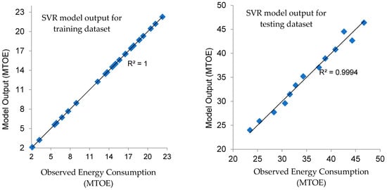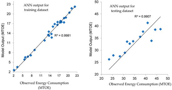 Figure 11 is a scatter plot illustrating the correlation between the data and the model’s predictions. An identity line, i.e., a y = x line, is generally drawn as the reference. The data points coincide with the identity line whenever the model’s predictions and observations are in perfect numerical agreement. For both the test and training datasets, the scatter diagram of the observable data and the model output showed that the prediction model reasonably conforms to the observed data. The coefficients of determination (R2) values are also satisfactory. Removing the trend line to concentrate on the nonlinear aspect of energy consumption and employing the twofold smoothing procedure for given input projection may account for the reliability of the observed data and the model’s predictions.