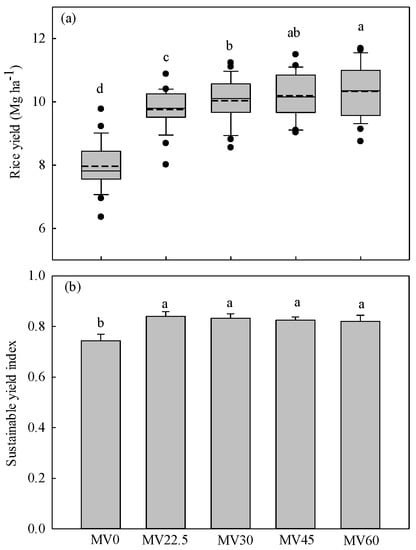 Rice yield was markedly affected by treatment, year, and interactive effects (treatment × year; Table S1, p < 0.001). Over the 7 years, the average rice yield under all treatments exhibited the following order: MV0 < MV22.5 < MV30 < MV45 < MV60. The yield under the four MV treatments was markedly higher than that of the MV0 treatment by 22.5–29.7%, and there was a similar trend each year (Figure 1a and Figure S1). In 2014 and 2015, the rice yield under MV30, MV45, and MV60 was markedly higher than that under MV22.5, and no significant difference was observed between MV45 and MV60. However, rice yields were not significantly different among the four MV treatments from 2016 to 2019. In 2020, the rice yield under MV45 was markedly higher than that under MV22.5, and no significant differences were observed between MV30, MV45, and MV60 (Figure S1). Across all treatments, the average rice yield in 2019 was 10.5 Mg ha−1, which was significantly higher than that in other years by 3.23–20.0%, and the lowest yield was observed in 2020. Compared with the MV0 treatment, the sustainability yield index markedly increased by 10.3–13.0% under the four MV treatments, and there was no significant difference among them (Figure 1b).
