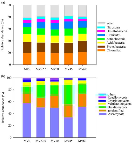 The dominant phyla of bacteria and fungi were identified by high-quality sequencing in all treatments (Figure 2). Chloroflexi (19.5–21.6%), Proteobacteria (15.8–18.7%), Acidobacteriota (11.7–13.5%), Actinobacteriota (10.4–12.0%), and Firmicutes (7.36–11.9%) were the five most abundant bacterial phyla across all treatments (Figure 2a, Table S2). The relative abundance of Firmicutes in the four MV treatments increased compared with the MV0 treatment, and the increases in MV22.5 and MV45 were statistically significant. The relative abundance of Desulfobacterota and Nitrospirotae showed no marked difference among all treatments.