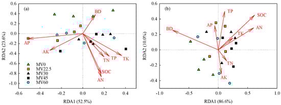 Compared with MV0 treatment, the application of MV improved the relative abundance of Firmicutes (Figure 2a and Table S2), which was analogous to the reports of Caban et al. [] and Gao et al. []. Firmicutes play important roles in maintaining the stability of agroecosystems and in withstanding extreme environmental conditions through producing spores [,]. Additionally, Firmicutes could effectively promote soil carbon and nitrogen cycling by secreting enzymes to degrade organic materials and plant-derived polysaccharides, and participating in various nitrogen metabolism functions [,], which might be conducive to improving soil quality. Among fungi, the dominant phylum associated with MV addition was Ascomycota in our study (Figure 2b and Table S3), which was similar to the results of previous studies on maize fields and an apple orchard in the Loess Plateau of China [,]. These results indicate that Ascomycota is a ubiquitous fungal phylum with important roles in agroecosystems []. Our results showed that the relative abundance of Ascomycota first reduced, and then increased, with increased MV rates. The results might be attributed to increases in soil nutrient levels from MV0 to MV45 and the reduction of soil nutrient levels in MV60. Kong et al. [] also indicated that the preferred conditions for Ascomycota to grow successfully might be low nutrient levels; thus, the relatively high nutrient levels might decrease the relative abundance of Ascomycota [,]. However, excessive input of MV decreased soil nutrient levels, particularly soil AN content, and then slightly increased the relative abundance of Ascomycota. The application of MV reduced the relative abundance of Chytridiomycota (Figure 2b and Table S3), which might be due to changes in some soil physicochemical properties (e.g., SOC and TN). This was in accordance with the reports of Liang et al. [] and Wang et al. [], who confirmed that the relative abundance of Chytridiomycota was negatively correlated with most soil characteristics, including SOC and TN.