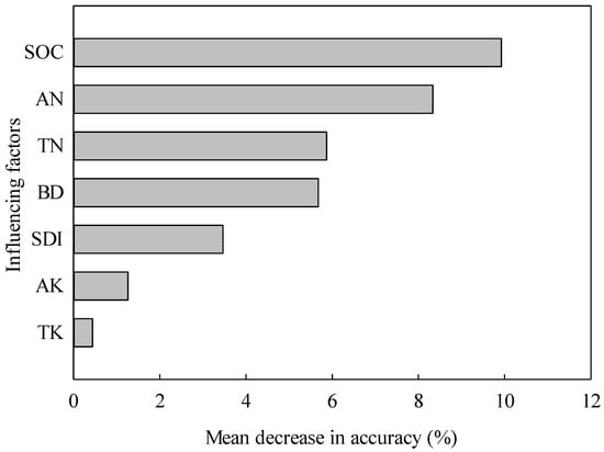 Importance of soil properties in rice yield between different MV-dosage treatments by random forest classification analysis, expressed as variable importance (mean percentage decrease in accuracy). SOC, soil organic carbon; AN, alkali solution nitrogen; TN, total nitrogen; BD, bulk density; SDI, Shannon diversity index of bacterial community; AK, available potassium; TK, total potassium.