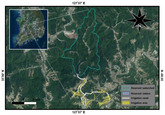 This study focused on a reservoir with a simple supply system: Jangan Reservoir, located in Jangan-dong, Seo-gu, Daejeon Metropolitan City, in central South Korea (127°07′ E, 35°00′ N). Figure 1 shows a satellite photo of the reservoir and irrigation canal. The reservoir was built in 1993 to supply downstream agricultural water.