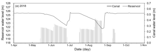 From the canal data, the supply began on 14 May 2018, 11 May 2019, and 3 May 2020. The supply ended on 13 August 2018, 6 August 2019, and 5 September 2020. During these periods, water was supplied while maintaining the level data between 37.5%–53.8% of the canal height. The reservoir supply was controlled between two and six times based on the canal levels data. The number of days of the water supply was 89 in 2018, 102 in 2019, and 72 in 2020. Using the reservoir level data during irrigation, it can be estimated whether the water supply was consistent by the decrease in the reservoir level. There were limitations in determining whether the water was supplied from the reservoir using only reservoir level data. In contrast, the canal level data provided useful information regarding the reservoir supply.