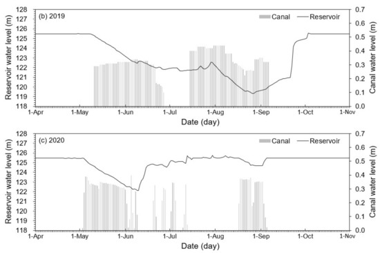 Water levels in the reservoir and canal for (a) 2018; (b) 2019; and (c) 2020.