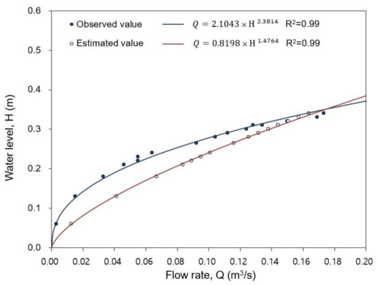 Figure 4 illustrates a comparison of the observed and estimated flow values, based on whether the flow was measured in the canal. The white circles denote the actual flow values; the water level–flow relationship equation was calculated using the following equation: