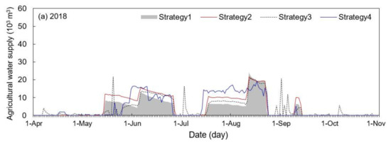 Figure 5 depicts a time-series comparison of the daily agricultural water supply determined according to each reservoir supply calculation strategy. The results obtained by the measured (S1) and theoretical flow rate (S2) methods showed significant differences, but with similar patterns. For S3, there were several issues in the estimation of water supply by field water managers. First, it was estimated that water supply occurred even though the actual water supply was stopped. In addition, for 2020, the estimated supply was double the actual value. For S4, the calculated amount based on the water demand design value was smaller than that determined by measurement (S1), except for part of 2018. Further, with S4, it was estimated that the water supply existed even during the midsummer drainage or when the water supply did not occur.
