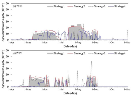where Qs4 is water supply for strategy 4 (m3/day); IA is the irrigation area (m2); IWt is the required irrigation depth (mm); PDt and PDt−1 are the ponding depths in the paddy field on days t and t − 1 (mm), respectively; I is infiltration (mm); ET is evapotranspiration (mm); and PR is rainfall in the paddy field (mm).