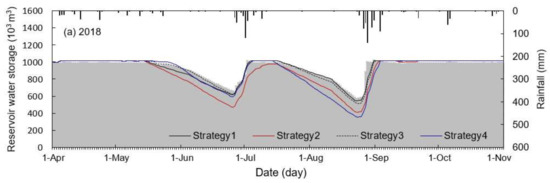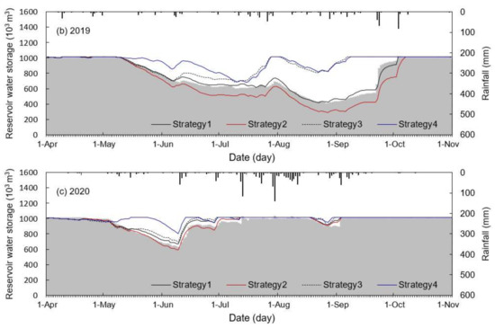Changes in the reservoir water storage using strategies S1–S4 for (a) 2018; (b) 2019; and (c) 2020. The gray shading indicates the observed storage volumes.