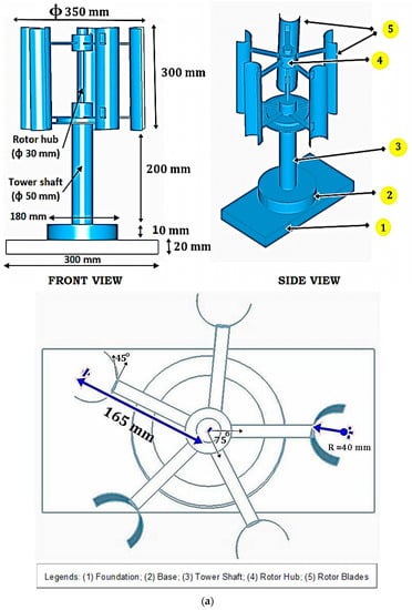 The schematic diagrams and photographic views of the installed vertical-axis wind turbines are portrayed in Figure 2. As observed, the rotor hub (diameter: 30 mm) was attached to the tower shaft (diameter: 50 mm) by means of a telescopic connection with a ball bearing to minimize the frictional resistance during rotation. Five equally spaced aluminum blades were connected to the rotor hub, each of which being a circular arc with an inner radius of 40 mm and a semi-arc angle of 45°; the projected size of each blade was 58 mm × 300 mm. Curved-type multi-blades (five blades) made of aluminum alloy (6061-T6) were utilized in the model vertical-axis wind turbine used in the study. Aluminum alloy 6061-T6 is widely used in many sectors including aircraft, defense, automobiles, and marine areas due to its satisfactory strength and stiffness, low weight, and better corrosion resistance properties [40,41]. Thus, such material leads to a reduction in the overall weight of the wind turbine while increasing its durability, thereby improving its performance. The tower shaft is rigidly connected to the steel circular base of 180 mm diameter and 10 mm thickness, which is in turn connected to a wooden square base of size 300 mm and 20 mm thickness. The wooden base is permanently bolted to the laboratory floor. The rotation of the shaft was initiated by artificial air flow by a pedestal fan which is capable of operating at low, medium, and high speeds. Since the WT is not equipped with any step-up gear system, an air blower was used to achieve very high speeds of the rotor shaft. The rotational speed of the shaft was measured by a laser-beam-operated tachometer.