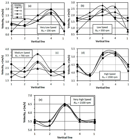Variation in v for shaft speed: (a) very low, (b) low, (c) medium, (d) high, and (e) very high.