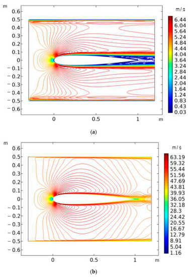 The steady-state velocity and pressure fields were simulated using the COMSOL CFDTM (version 5.6) for a small-scale model vertical-axis wind turbine. To bring parity in the numerical analysis, comparative studies of inlet wind speeds representing both laminar and chaotic air flows were conducted, with values of 5 m/s and 20 m/s representing laminar and turbulent flows, respectively. The 2D geometry of the NACA 0012 airfoil was developed using the COMSOL Multi-Physics graphics user interface, which was then placed in a rectangle area with a size of 1.5 m in length and 1 m in width, representing a section of a wind tunnel (see Figure 19). The top and bottom edges of the rectangular area, as well as the surface of the airfoil, were set as wall boundary conditions, while the left and right edges were set as inlets, with uniform and horizontal wind flow. The pressure at the outlet was taken as zero.