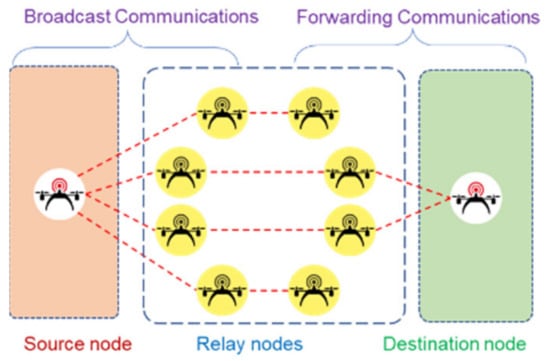 2]. As the number of communication nodes in a cluster network increases, the selection of the optimal relay node will consume a large amount of energy. However, the energy provided by UAVs for communication is limited, so UAV communication requires low energy consumption [