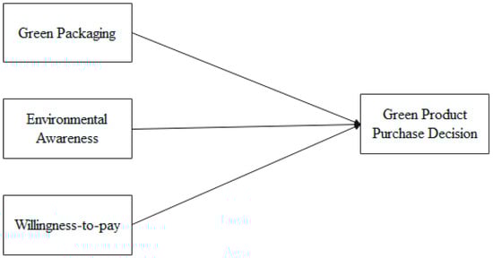 This study is guided by the theory of planned behavior (TPB) []. The theory is used to understand and predict human behavior. TPB is a theory in social psychology and one of the best supported theories among social psychological theories. TPB offers an all-inclusive yet parsimonious psychological theory that identifies a creative form for explaining a broad range of human behavior []. Behavior can be interpreted widely or narrowly and is a function of the researcher’s theoretical or applied objectives []. However, according to TPB, any behavior can be considered in terms of four constructs, namely, action, target, context, and time []. Therefore, the current study conceptualized the attitudinal behavior of consumers of manufactured food products as green packaging, environmental awareness, and willingness to pay for green products in consumers’ green purchase decisions, as the supporters of the theory argue that any measurement of behavior must specify how the behavior is to be accurately measured or understood []. TPB was used in this study because a critical examination of the literature showed that the theory was utilized to analyze consumer green product purchase decisions [,,]; however, despite TPB being widely used, its applicability within the food manufacturing sector in Ghana has received little attention.