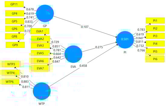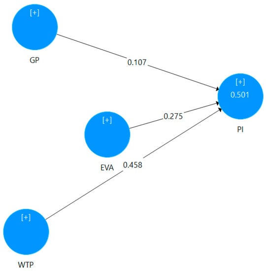 From the results in Table 7 and Figure 3, the path coefficients and the p-values show that out of the three hypotheses tested, one path relationship (GP- > PI) was insignificant (i.e., H2). Specifically, EVA significantly predicted PI (β = 0.279; t = 3.125; p = 0.002), indicating that a one-unit increase in EVA would increase the expected value of PI by 0.279, thereby supporting H1. Moreover, WTP significantly predicted PI (β = 0.458; t = 5.753; p = 0.000), indicating that a one-unit increase in WTP will increase the expected value of PI by 0.458, thereby supporting H3.