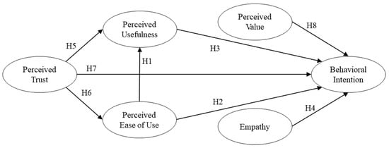 Perceived trust involves the user’s belief in the reliability of technical systems or services [] and the potential of technical systems or services to perform the tasks required by users well []. Perceived trust has been applied to online websites [], tourism [] and self-service hotel technology [] and has been proven to have a significant impact on users’ intention to use. The research of Mukherjee, Baral, Venkataiah, Pal and Nagariya [] proved that trust has a positive impact on perceptions of two beliefs: perceived usefulness and perceived ease of use. In addition, a study by de Graaf and Ben Allouch [] found that users’ trust in technology will significantly affect their perception of robots’ practicability. However, the guarantee of effectiveness obtained by people from their interaction with robots depends on the degree of trust people have in robots and the information they transmit []. Park and Stangl [] pointed out that, when new technologies are applied to the hotel service industry, perceived trust is an important antecedent variable. In this study, perceived trust was interpreted as the elderly customers’ perception of the reliability of the service or information provided by hotel service robots in terms of quality, privacy protection and security. In summary, the trust of the elderly in hotel service robots may also be an important factor, so it should be taken into account. Therefore, the following hypotheses were proposed: