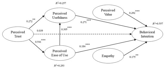 After the analysis of the measurement model, the structural model was analyzed. According to the suggestions of Hair, Ringle and Sarstedt [], 5000 repeated samples were used to calculate the significance of the path coefficient. Table 5 and Figure 2 are the path coefficients and their significance evaluation results. As shown in Figure 1, the perceived ease-of-use had a positive impact on the perceived usefulness (β = 0.305, t = 3.771; p < 0.001) and intention to use (β = 0.184, t = 3.680; p < 0.001) in using the hotel service robots, so H1 and H2 were supported. Perceived usefulness had a positive impact on elderly tourists’ intention to use hotel service robots (β = 0.271, t = 4.779; p < 0.001), which confirmed H3. The results show that empathy had a significant positive impact on intention to use (β = 0.175, t = 2.728; p < 0.01), so H4 was confirmed. This study also showed that perceived trust had a direct and positive impact on perceived usefulness (β = 0.272, t = 3.112; p < 0.01). Furthermore, perceived trust also had a direct and positive impact on perceived ease of use (β = 0.541, t = 9.802; p < 0.001), which indicated that elderly tourists trusted hotel service robots to provide relevant services, so H5 and H6 were supported. However, perceived trust had no direct effect on users’ usage intentions (β = 0.039, t = 0.508), so H7 was not supported. In addition, the research also showed that perceived value had a direct and positive impact on intention to use (β = 0.292, t = 4.864; p < 0.001), so H8 was supported. The results show that perceived trust had the greatest impact on the intention to use, with the second influential being perceived usefulness and the third being perceived ease of use.