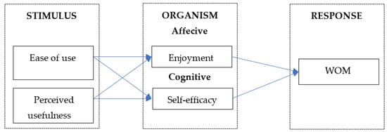 According to [,], in e-commerce, external stimuli could be due to the order and complexity of the web page, graphics, colors, links, menus, the aesthetic appearance of the page, background music, availability of products, ease of use of the site, m-payment, design, information, and effectiveness, among others. Therefore, for this research, consumers’ perceptions of the web store’s ease of use and usefulness will be analyzed as external stimuli. Likewise, [] identified that the most frequently used emotional evaluations, categorized as “organism”, are excitement, pleasure, impulse, enjoyment, and flow. Furthermore, the same study points out the most studied behavioral responses in e-commerce: repurchase intention, impulse buying behavior, purchase, consultation, and search for other shopping websites. Therefore, in this research, starting from the gap in the literature, we propose to study the WOM behavior of consumers as a response within the SOR model, identifying the variables enjoyment and self-efficacy as organism elements.