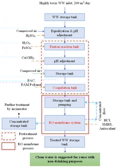 Before the WWTP operation, preliminary experiments at a lab-scale were conducted to determine the optimal parameters of physicochemical pre-treatment processes (i.e., Fenton and coagulation processes). Accordingly, for the Fenton experiments, four duplicate experiments were conducted to determine the optimal values of reaction time, pH, H2O2 dosage, and FeSO4 dosage. For the coagulation experiments, three duplicate tests were carried out to determine the optimal pH, PAC dosage, and PAM polymer dosage. The pre-treatment helped in improving the performance of the RO membrane system in the next stage.