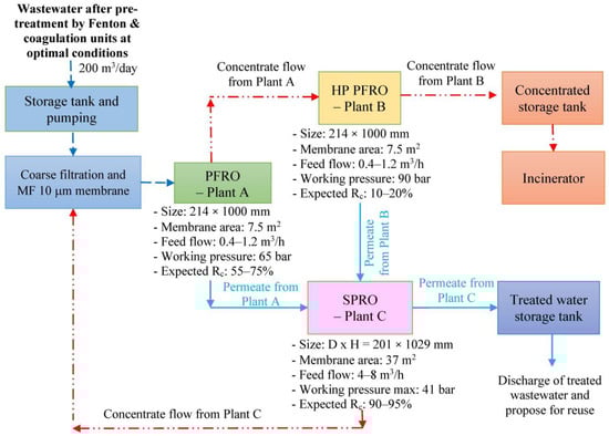 For the RO membrane system, the technical specification of each RO module and operational parameters are presented in the flow diagram in Figure 2. The coarse filtration and microfiltration (MF) module (pore size of 10 μm, Pentair, USA) were designed as pre-filtration units before the RO modules. Three different types of RO modules (pore size of 0.0001 μm, ROCHEM, Germany) (i.e., PFRO, HP PFRO, and SPRO) were installed at the same time to treat the feed wastewater and recover the concentrated flow. Specifically, the PFRO (Plant A) received the output flow of MF filtration, whereas HP PFRO (Plant B) was used to treat the concentrated flow. In order to enhance the quality of treated wastewater, the permeate flow from both PFRO and HP PFRO modules was passed to the SPRO module (Plant C). The feed flow, working pressure, and expected RC were designed differently among these RO modules. During the operation, 30% hydrochloric acid (HCl), sodium metabisulphite (SMBS, Na2S2O5), and other common antiscalants, were used for membrane cleaning and prevention of fouling.