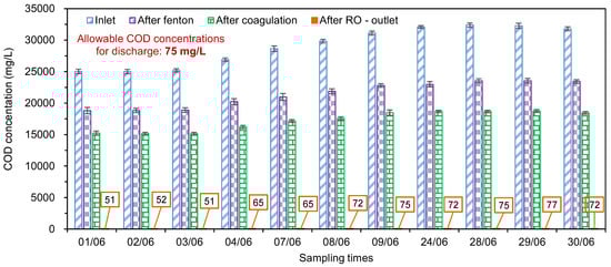 The wastewater samples were collected at different points (i.e., the inlet, Fenton outlet, coagulation outlet, and SPRO outlet) of the WWTP during the investigation period of 5 months. The removal efficiency was calculated based on the COD concentration measured in the real wastewater samples. Due to the large number of samples analyzed and results obtained in this long-term investigation, the results recorded during June 2021 were chosen and are shown in Figure 3.